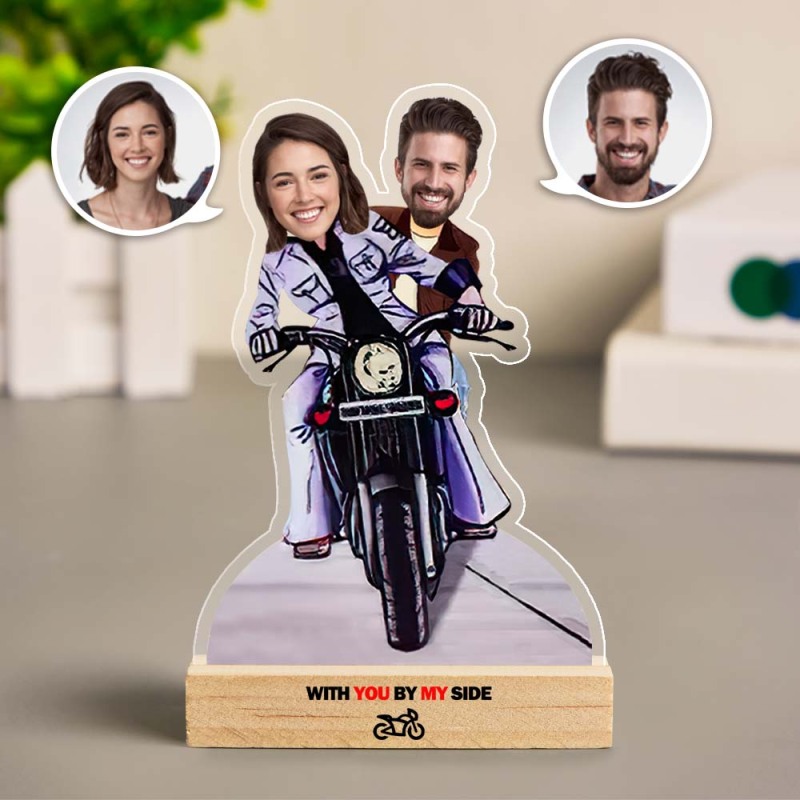 Custom Motorcycle Couple Caricature with Wooden Stand Personalized Face MiniMe Decor Original Funny Gifts